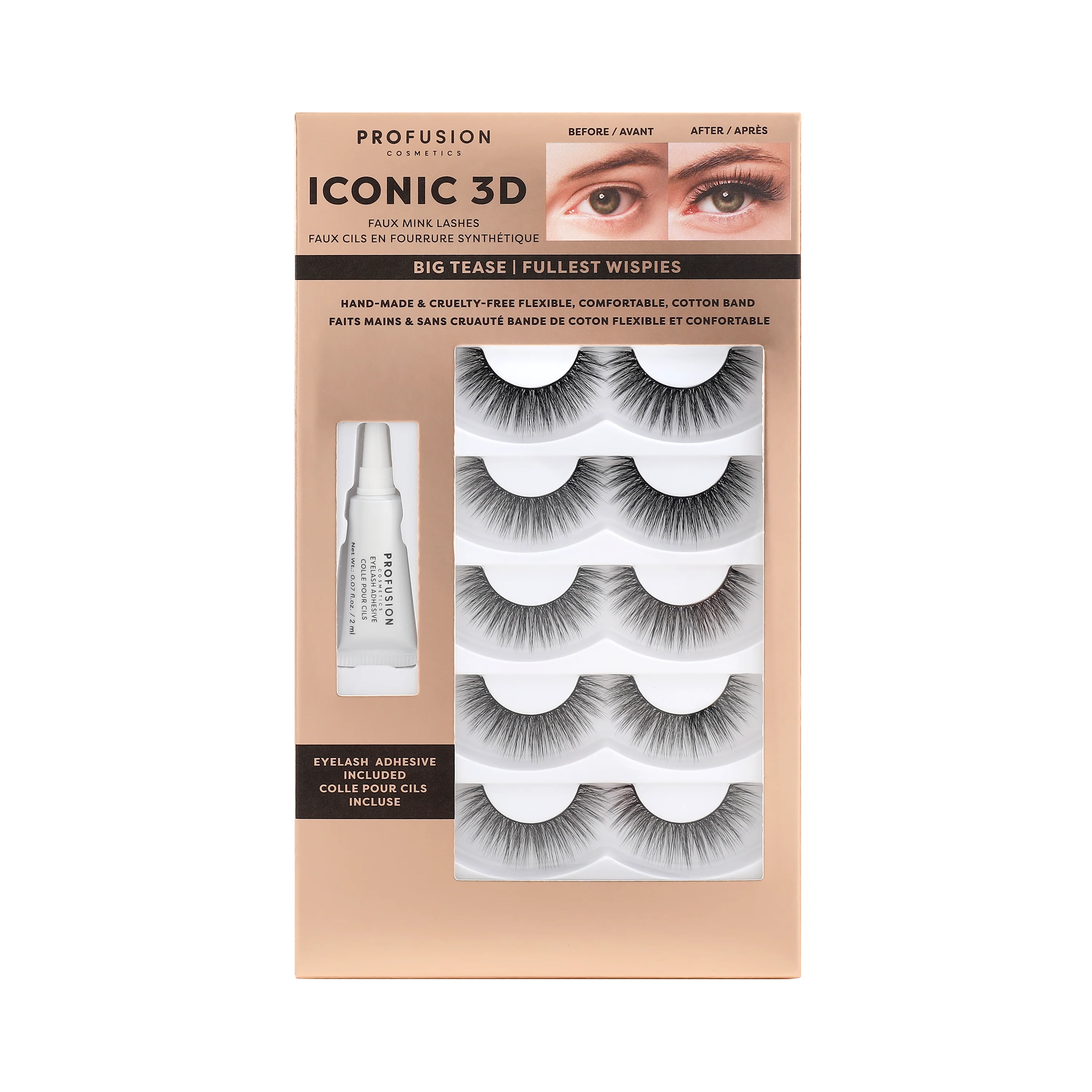 • 5 pairs of 3D faux mink lashes in a mix of natural and dramatic styles